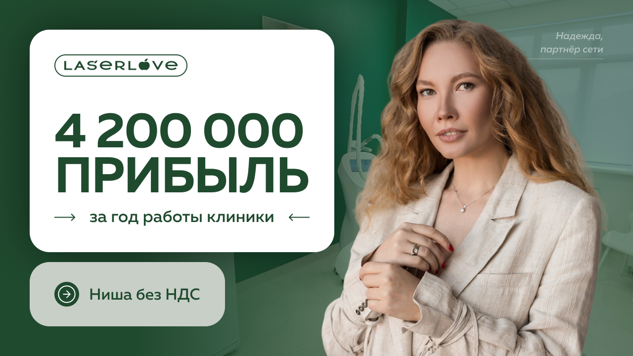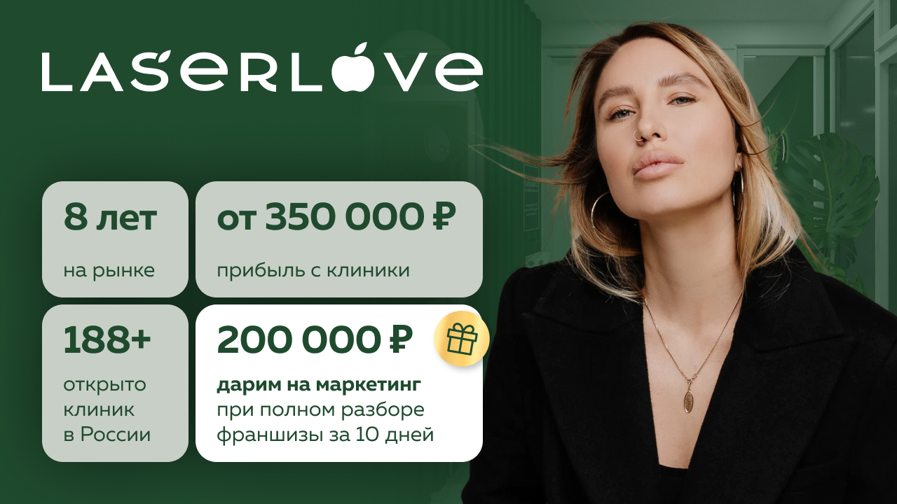 LaserLoveСтоимость900 000 ₽Инвестиции4 600 000 ₽Окупаемость14 мес.Доход1 000 000 ₽Красота не уходит в кризис — люди продолжают инвестировать в себя. Лазерная эпиляция сегодня — один из самых стабильных и быстрорастущих сегментов. С франшизой LaserLove вы входите в бизнес с лидером рынка: более 220 успешно работающих студий по всей России. При поддержке опытной команды управляющей компании партнёры зарабатывают от 400 000 ₽ в месяц при рентабельности до 40%. Оставьте заявку — обсудим детали, гарантии и спецусловия запуска.