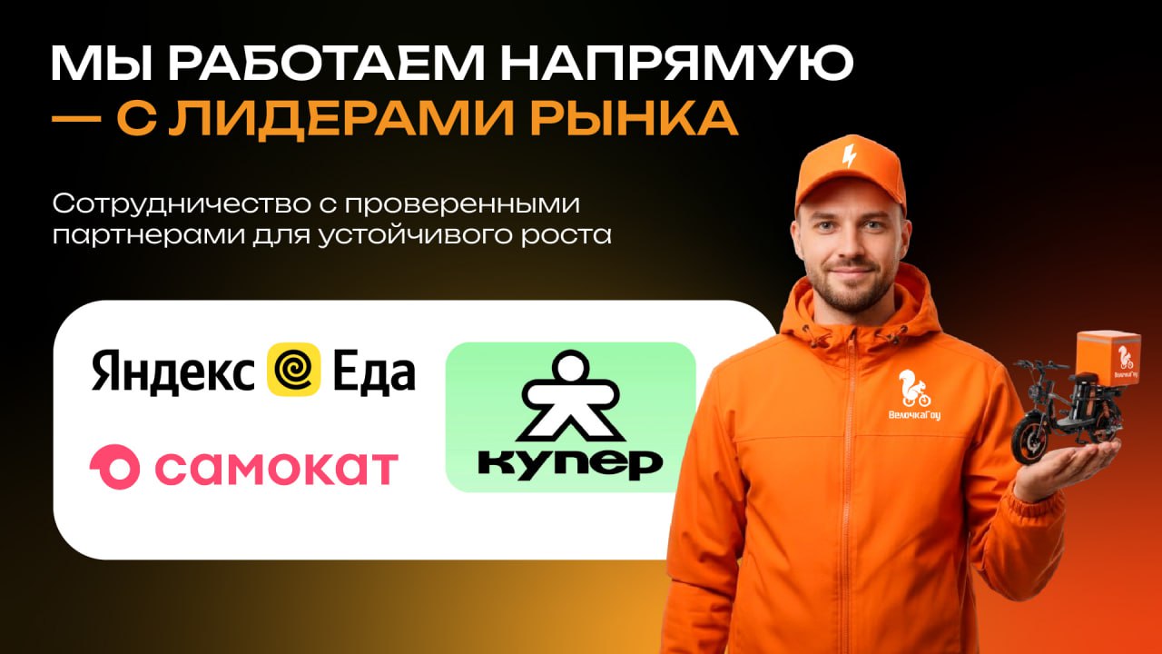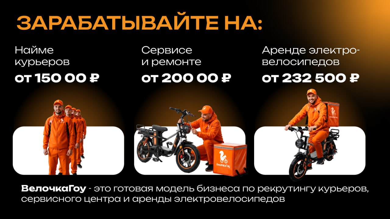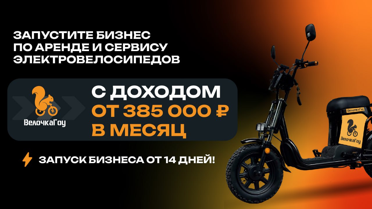 Франшиза «ВелочкаГоу» — уникальный проект, объединяющий 3 направления: сервис электротранспорта, рекрутинг курьеров для служб доставки и аренду электровелосипедов для курьеров. Средняя чистая прибыль после выхода на плановые показатели может достигать до 700 000 руб. в месяц. Для новых партнёров предлагается велопарк из 15 электровелосипедов всего за 890 000 руб..