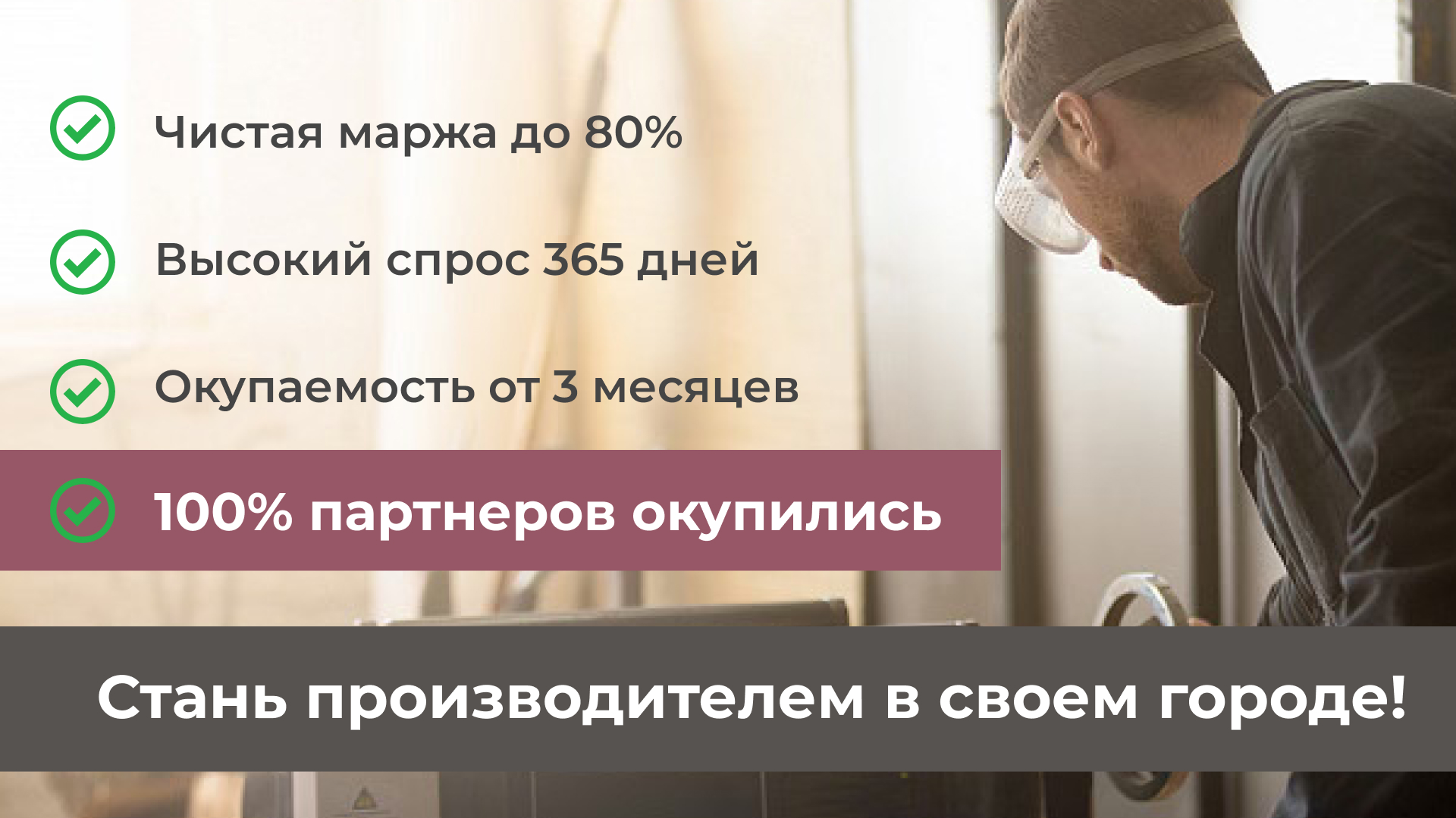 Окна-НоваСтоимость420 000 ₽Инвестиции100 000 ₽Окупаемость3 мес.Доход220 000 ₽Франшиза «Окна-Нова» — БИЗНЕС ДЛЯ НАСТОЯЩИХ МУЖЧИН! Это проверенный бизнес в растущем рынке ремонта жилья - рынок новостроек активно растёт на 30% ежегодно. Вы запускаетесь за 3–4 недели без склада и офиса и выходите на доход от 220 000 рублей в месяц с наценкой до 80%. Модель проверена в 80+ филиалах за 13 лет работы. Привлечение клиентов и маркетинг берём на себя. Оставьте заявку и получите подробную презентацию франшизы.