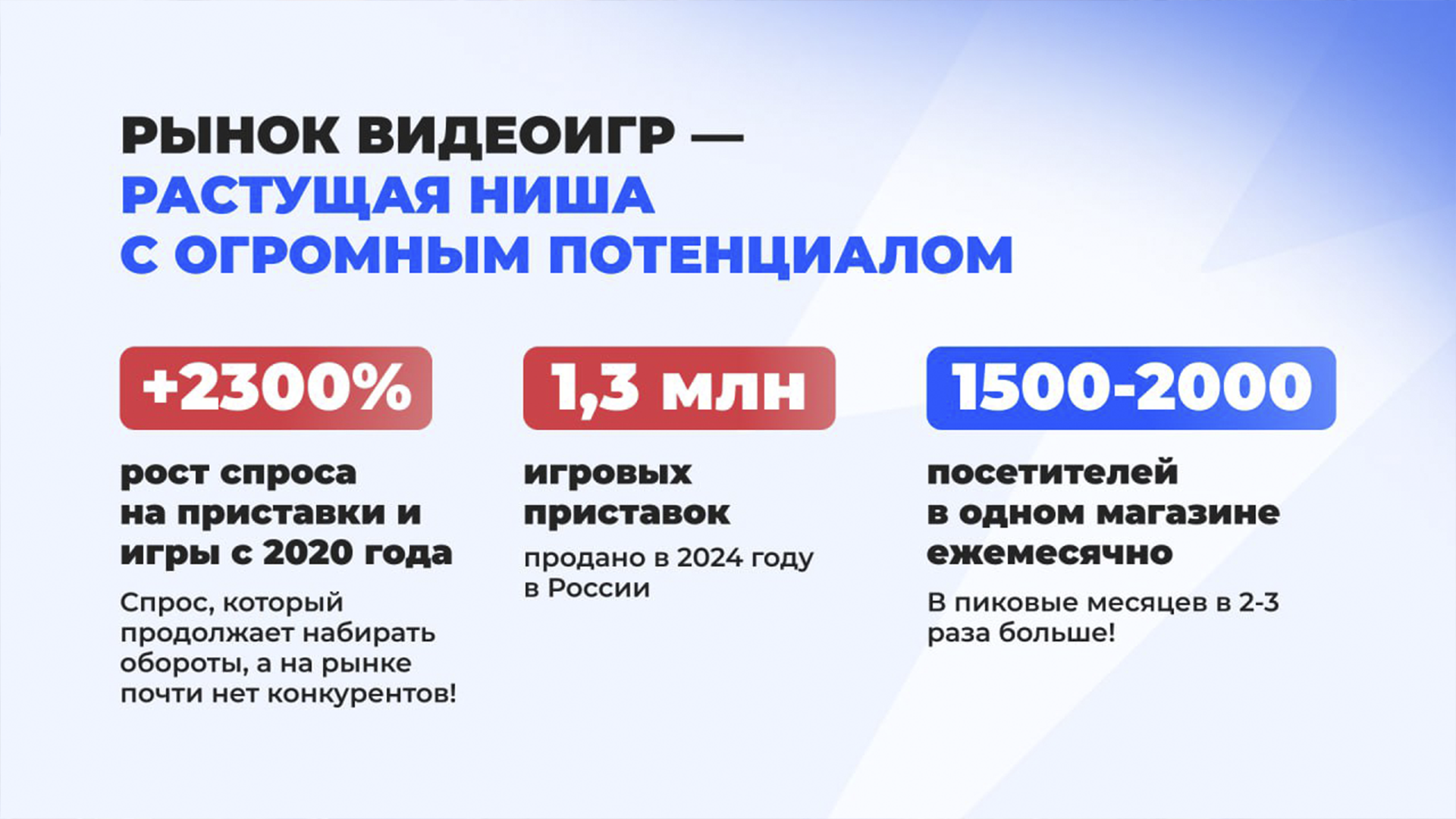 VoltGameСтоимость550 000 ₽Инвестиции1 195 900 ₽Окупаемость7 мес.Доход230 000 ₽Откройте магазин видеоигр и приставок с доходом от 250 000 рублей в месяц и окупаемостью 7-10 мес. Рынок видеоигр в России растёт с темпом около +9% в год. Формат подходит даже новичкам — обучение, маркетинг и готовая модель включены. Высокий спрос, повторные покупки, товар сам себя продаёт. Не окупитесь за год — выкупим товар по договору. Сейчас исключительное время захватить растущий рынок гейминга!