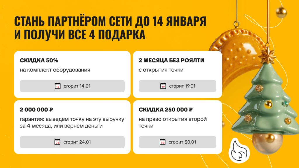 ПончикофСтоимость360 000 ₽Инвестиции1 800 000 ₽Окупаемость16 мес.Доход250 000 ₽Пончиковая «Пончикоф» — бизнес, который невозможно пройти мимо. Пышные, горячие пончики с щедрыми начинками, которые становятся вашим фирменным отличием на рынке. Производство устроено так, чтобы вы могли работать быстро, стабильно и с минимальным штатом, обеспечивая постоянный поток клиентов. Формат универсален: островок в ТРЦ, небольшое кафе или точка навынос. Это бизнес, который дарит людям эмоции, а вам — регулярный доход уже в первые месяцы.