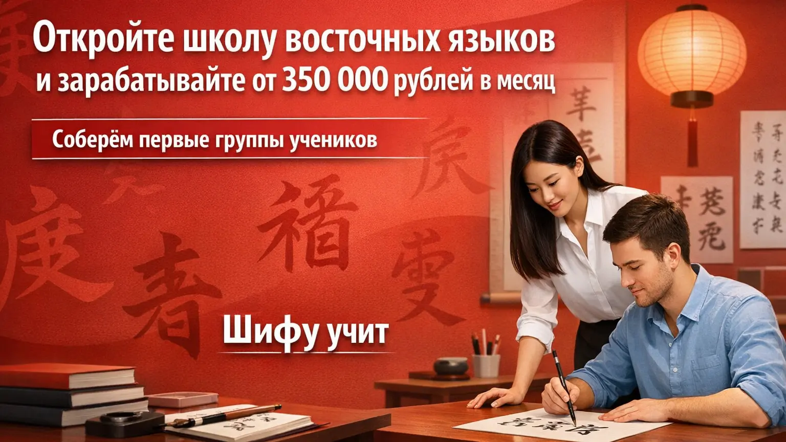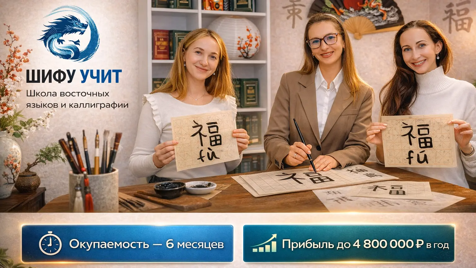 ШИФУ УЧИТСтоимость480 000 ₽Инвестиции1 050 000 ₽Окупаемость6 мес.Доход350 000 ₽Откройте школу восточных языков и каллиграфии ШИФУ УЧИТ с прибылью до 4 800 000 рублей в год! Получите полное сопровождение: поиск помещения, обучение персонала, формирование первых групп учеников. Мы обучаем китайскому, японскому, корейскому и помогаем поступать в топовые вузы Китая по грантам. Уникальная методика и маркетинговая стратегия обеспечат вашему бизнесу успех и высокую прибыль!Шифу учит — быстрый вход в прибыльный рынок образования. Откройте школу восточных языков и каллиграфии с окупаемостью от 6 месяцев. Спрос на специалистов со знанием китайского за последний год вырос на 600%! Вы получаете полностью упакованный бизнес: помощь в запуске, обучение команды и сопровождение на всех этапах. Обучение китайскому, японскому и корейскому языкам по эффективной методике и сильный маркетинг позволяют быстро выйти на стабильную прибыль от 350 000 рублей в месяц!
