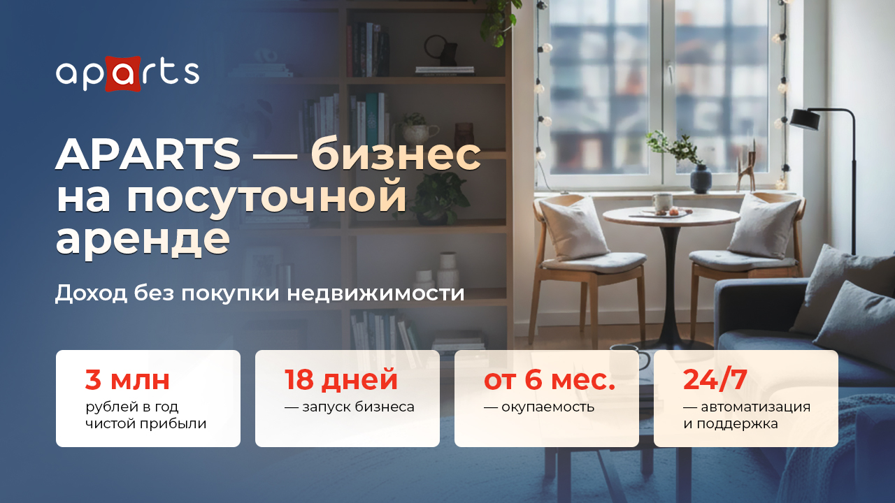 APARTSСтоимость470 000 ₽Инвестиции690 000 ₽Окупаемость6 мес.Доход250 000 ₽APARTS — франшиза с готовой системой управления посуточной арендой квартир, позволяющая быстро начать прибыльный бизнес в сфере недвижимости. Работаем по модели субаренды: арендуем квартиры у собственников или риелторов и сдаём их на короткий срок по более высокой цене. Франшиза включает обучение, поддержку и проверенные процессы, что обеспечивает стабильный доход от 250 000 рублей в месяц.