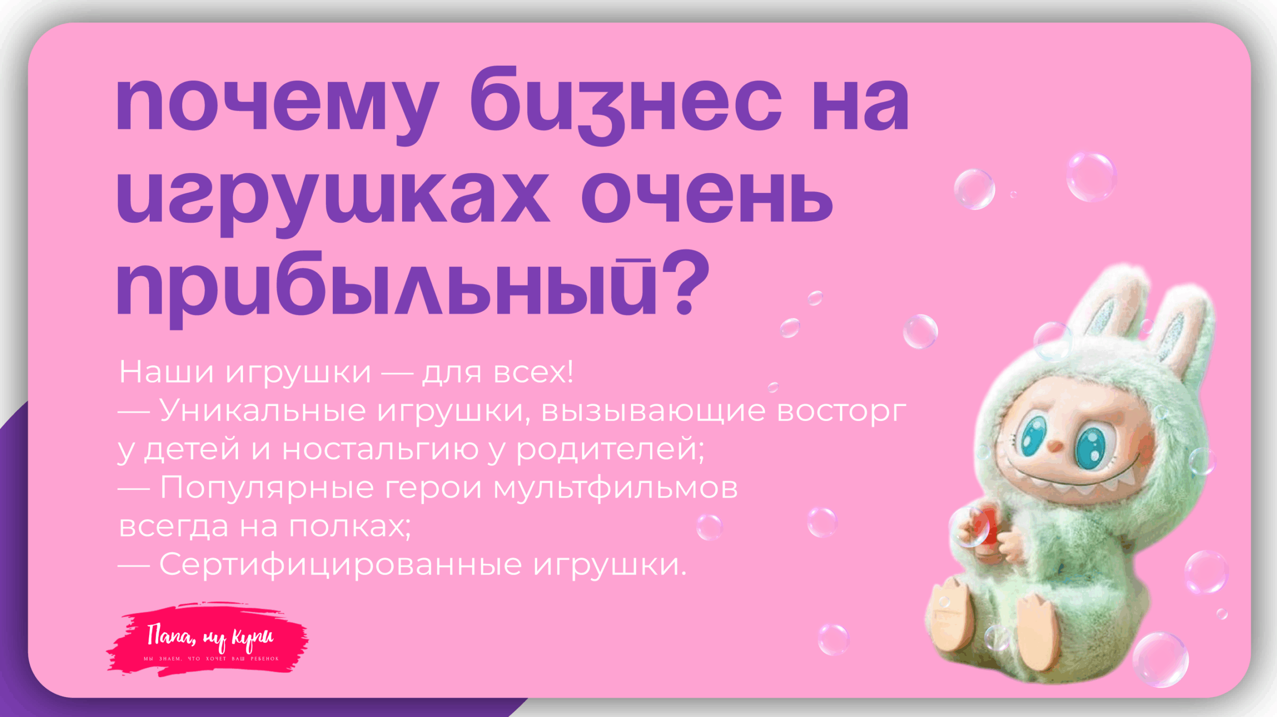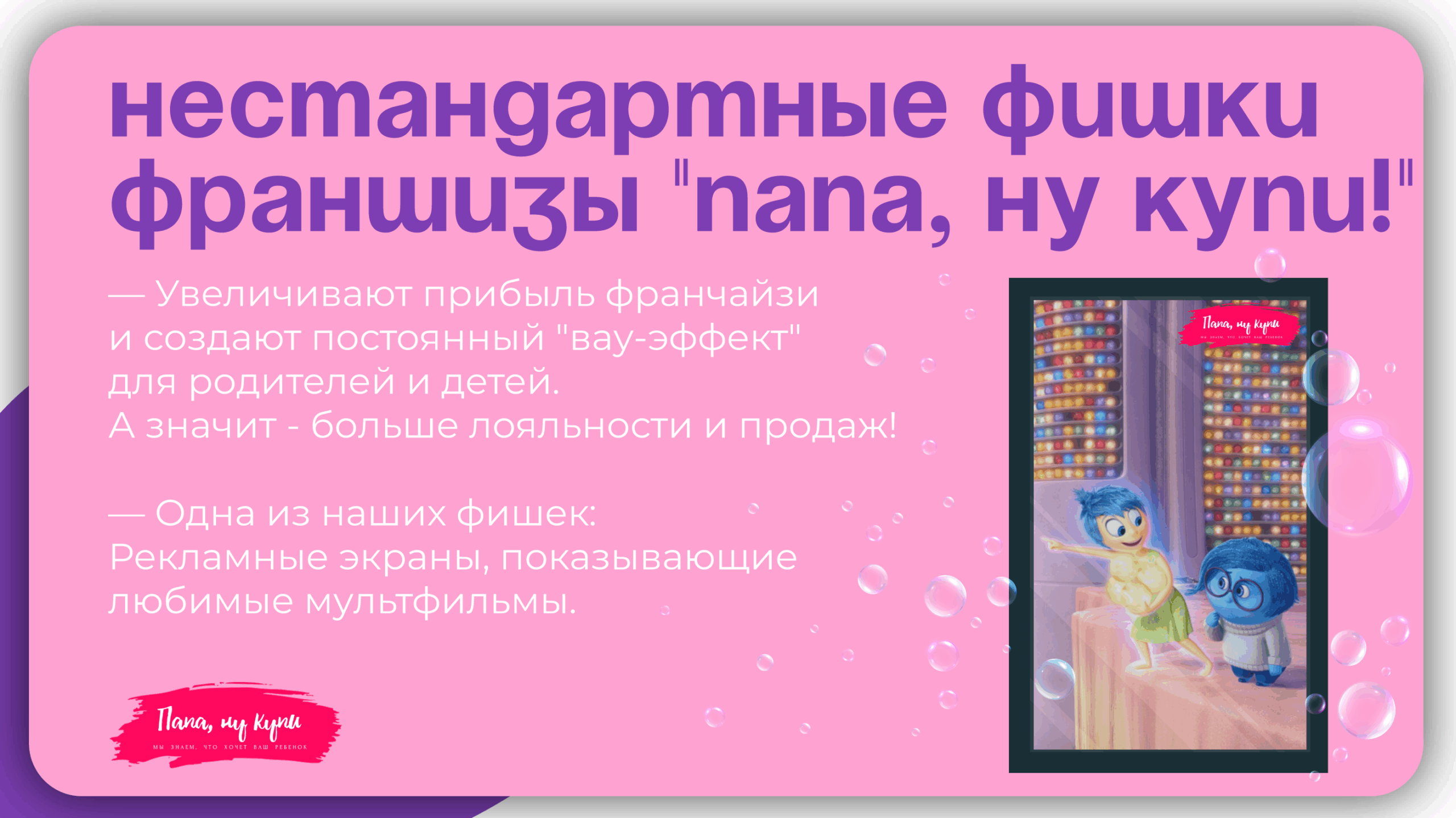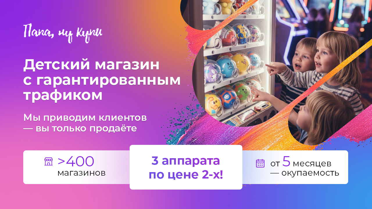 Папа, ну купи!Стоимость200 000 ₽Инвестиции500 000 ₽Окупаемость5 мес.Доход300 000 ₽Папа, ну купи! — франшиза с гарантированным доходом. Покупай 3 аппарата по цене 2 и зарабатывай от 300 000 руб. в месяц, продавая всего три игрушки в день. Выберите место с большим потоком детей и родителей — весь маркетинг мы берём на себя: от выбора самых популярных игрушек до стратегии продвижения вашего бизнеса. Простая модель, быстрый старт и стабильный доход!