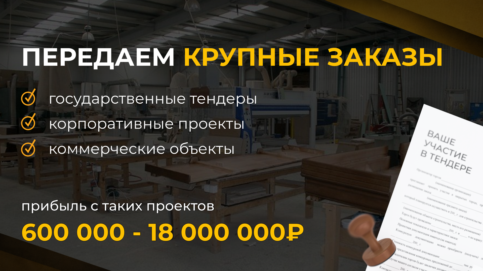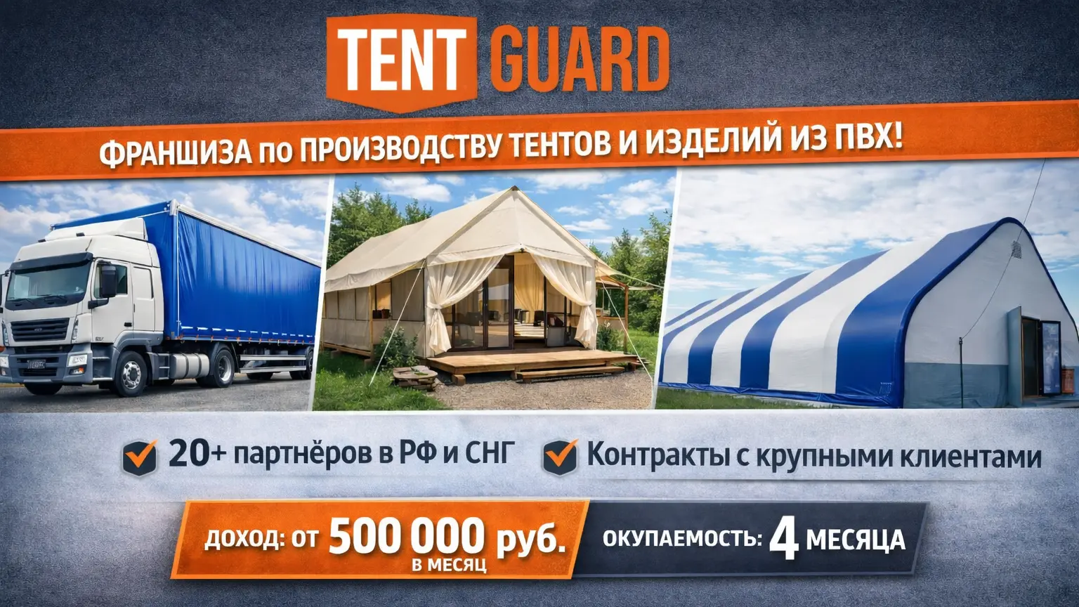 Tent GuardСтоимость690 000 ₽Инвестиции700 000 ₽Окупаемость4 мес.Доход500 000 ₽Tent Guard — франшиза по производству тентов и изделий из ПВХ. С 2020 года мы выпускаем тенты для фур/газелей, мягкие окна, глэмпинги, татами, ковры, пологи и т.д. Франшиза уже объединяет 20+ партнёров в России, Белоруссии и Казахстане и имеет контракты с крупными клиентами: Делко, Дел Транс, Деловые Линии, ПЭК, КИТ и др. Окупаемость вложенных инвестиций — 4 месяца. Входите в проверенный рынок с готовой бизнес-моделью и стабильными заказами.