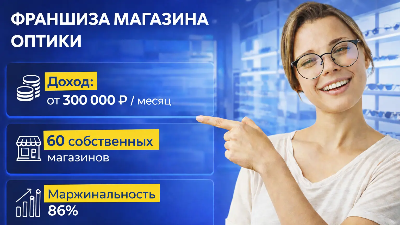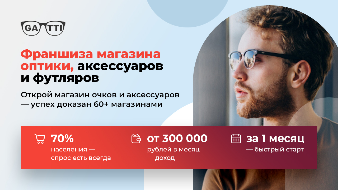 ГАТТИСтоимость590 000 ₽Инвестиции600 000 ₽Окупаемость6 мес.Доход300 000 ₽ГАТТИ — это франшиза оптических магазинов, аксессуаров и футляров с уже отработанной бизнес-моделью и 60 собственными точками по стране. Спрос есть всегда — до 70% людей хотя бы раз в жизни пользуются очками. Запуск за 1 месяц, средняя прибыль от 300 000 рублей, окупаемость около 6 месяцев. Мы помогаем партнёрам с подбором помещения, обучением персонала, настройкой ассортимента, маркетингом и системой CRM, чтобы бизнес был стабильным, понятным и максимально безрисковым.Федеральная франшиза магазинов готовых очков с устойчивым спросом и высокой маржинальностью до 86%. Бизнес строится на продаже товара первой необходимости без ярко выраженной сезонности и сложного производства. Франчайзи получает отлаженную модель: поддержку при запуске, готовый ассортимент, обучение персонала и аналитику продаж. Формат компактный и понятный в управлении, с возможностью масштабирования. Средний доход действующих точек начинается от 300 000 рублей в месяц и зависит от локации и трафика.