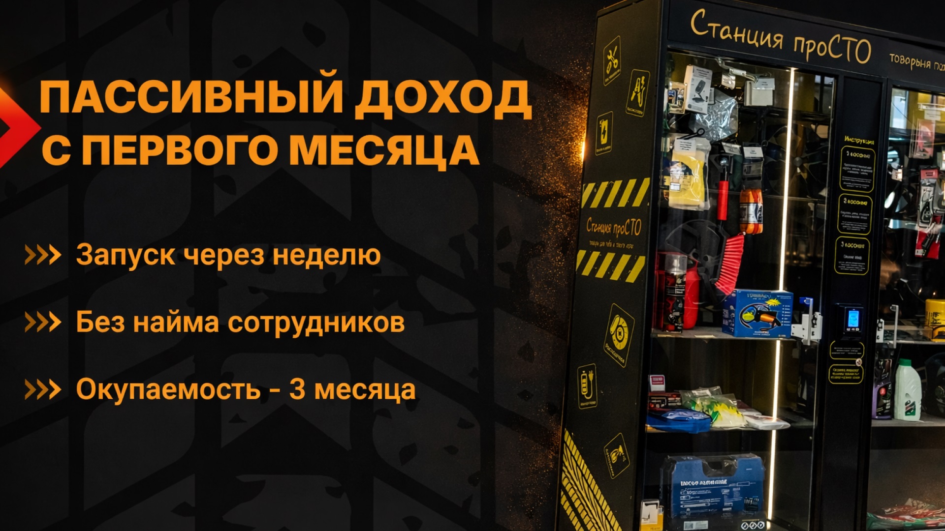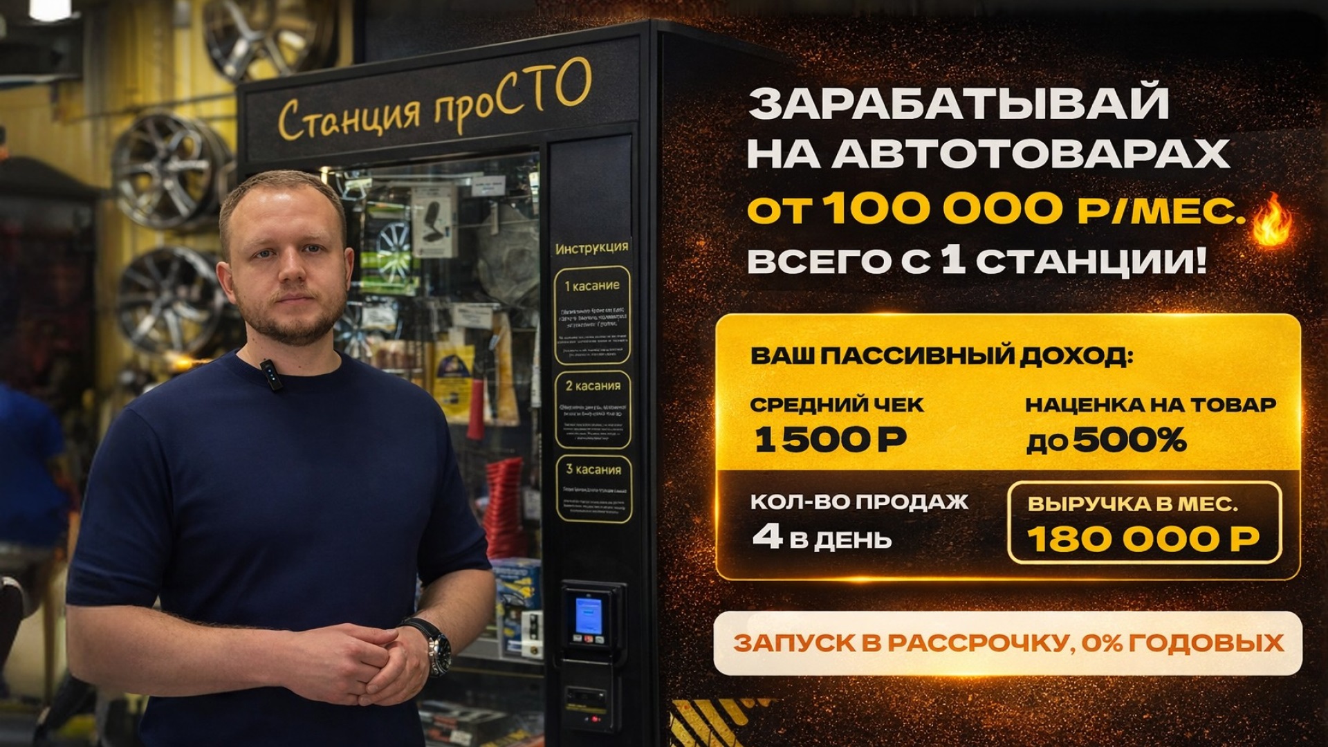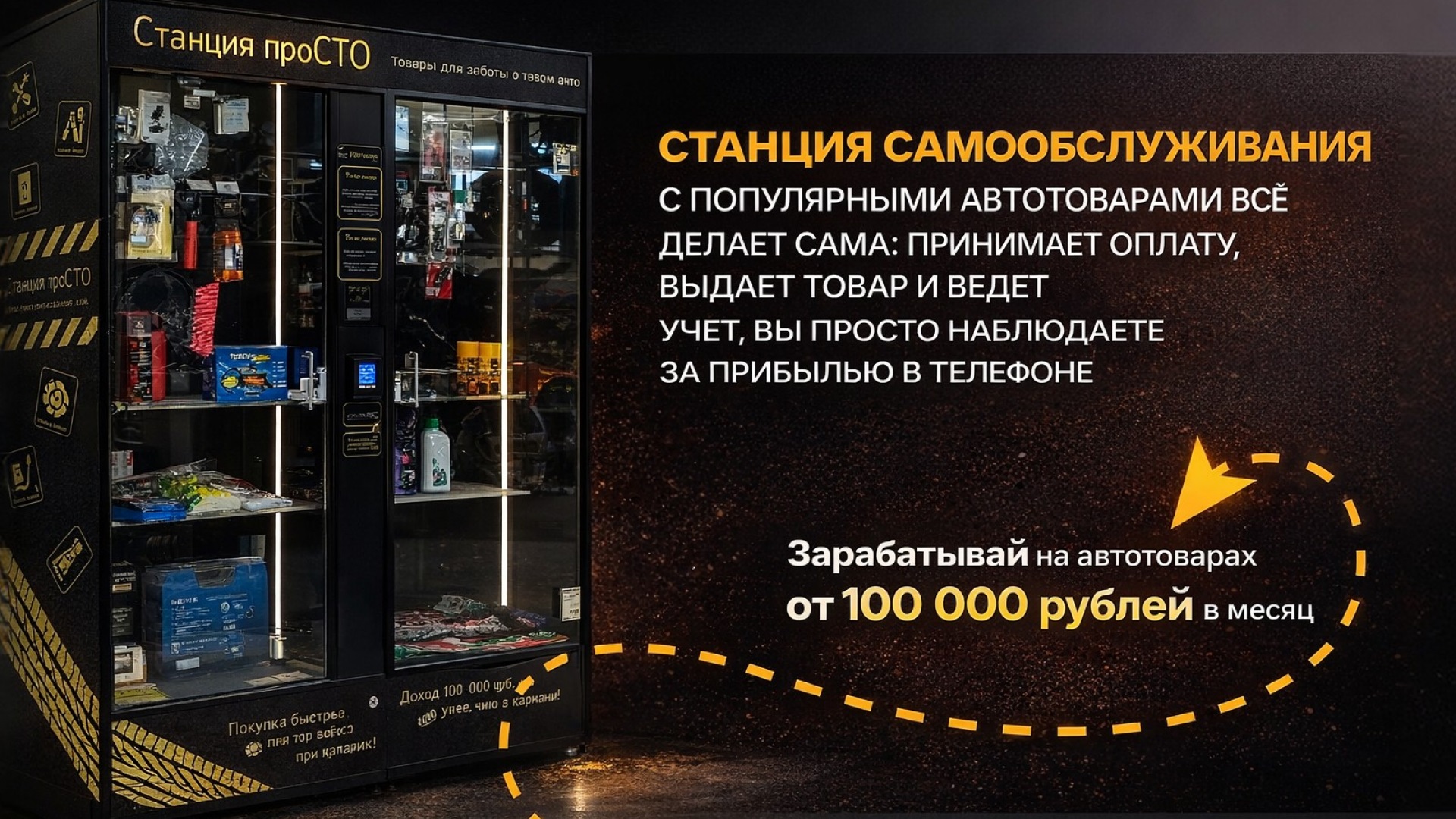 Станция ПРОСТОСтоимость240 000 ₽Инвестиции90 000 ₽Окупаемость3 мес.Доход100 000 ₽Станция проСТО — бизнес на автотоварах без персонала. Доход с первых месяцев! Готовый каталог из 100+ ходовых автотоваров, автоматические продажи 24/7 с контролем в телефоне. Мы запускаем под ключ:локация, юр. оформление, закупки, обучение и сопровождение. Без роялти. Гарантия продаж и окупаемости — по договору. Занятость — до 3 часов в неделю.