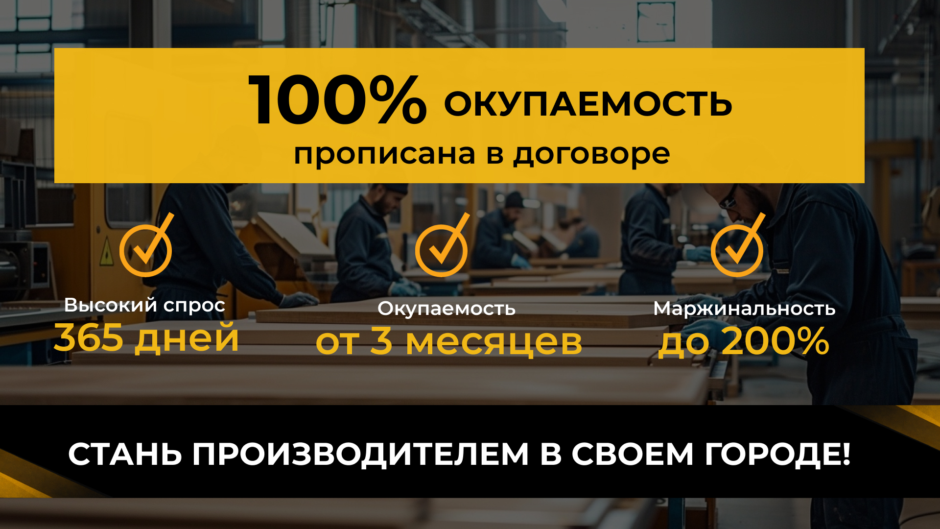 Отдел производстваСтоимость690 000 ₽Инвестиции200 000 ₽Окупаемость3 мес.Доход2 000 000 ₽Откройте прибыльный мебельный бизнес по франшизе с доходом от 2 000 000 ₽ в месяц. Производство корпусной мебели для частных клиентов и бизнеса: кухни, шкафы, офисная и торговая мебель. Запуск за 30 дней, обучение и поддержка 24/7. Проверенная модель, высокий средний чек и несколько источников дохода — продажи, производство и крупные проекты.