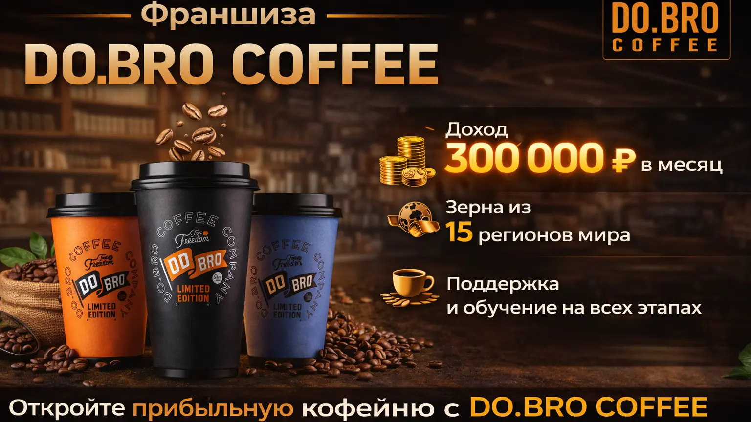 DO.BRO COFFEEСтоимость590 000 ₽Инвестиции2 300 000 ₽Окупаемость14 мес.Доход300 000 ₽DO.BRO COFFEE — франшиза сети кофеен, которые известны в России с 2005 года. Открыв кофейню, вы сможете зарабатывать от 300 000 рублей ежемесячно, используя зерна из 15 регионов. Франшиза подойдет, если даже у вас нет опыта в предпринимательстве — мы предоставляем поддержку на всех этапах проекта, проводим постоянное обучение сотрудников, готовим к открытию полноценную маркетинговую кампанию. Кофейная культура процветает, и наша культурная атмосфера гарантирует успех при полной поддержке.DO.BRO Coffee — франшиза для тех, кто хочет зарабатывать на кофе. Здесь не нужно изобретать формат и учиться на своих ошибках. Вы получаете проверенную модель кофейни с собственным производством кофе и сильным брендом. Запуск возможен без опыта и в любом городе. Потенциальный доход — от 300 000 рублей в месяц. Всё готово под ключ: обучение, поставки, маркетинг и сопровождение. Запросите презентацию франшизы и посмотрите, как DO.BRO Coffee может работать в вашем городе!