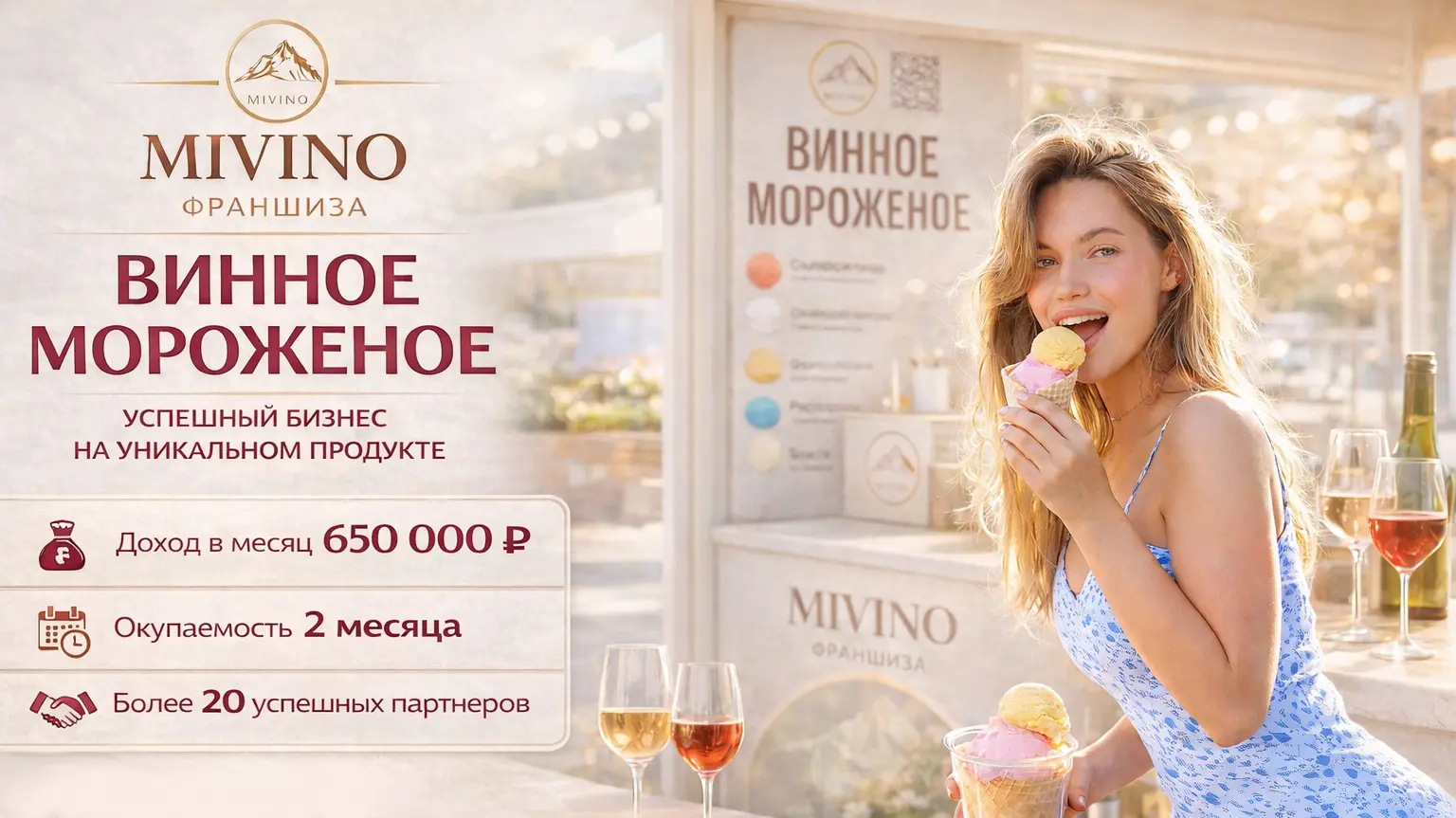 MIVINOСтоимость400 000 ₽Инвестиции1 000 000 ₽Окупаемость2 мес.Доход650 000 ₽С 2022 года создаем уникальные десерты – мороженое с добавлением вина, которое покоряет гурманов. Франчайзи зарабатывают до 650 000 рублей в месяц с маржой 50%, предлагая модный продукт с высоким спросом. Предоставляем помощь в выборе локации, подборе команды, создании стильного дизайна и маркетинговой стратегии. Более 20 партнеров уже успешно работают в нише с низкой конкуренцией. Рынок десертов стремительно растет, привлекая тех, кто ищет новые вкусы.MIVINO — это франшиза трендового винного мороженого с маржинальностью 50% и быстрым запуском. Уникальный продукт без алкогольной лицензии, до 20 авторских вкусов и высокий средний чек делают бизнес заметным и востребованным. Формат подходит для ТЦ, улиц и курортных зон. Окупаемость — от 2 месяцев, прибыль в сезон — до 650 000 рублей. Франшиза под ключ: бренд, обучение, поставки и поддержка. Готовое решение для тех, кто хочет зарабатывать на эмоциях и вау-продукте.