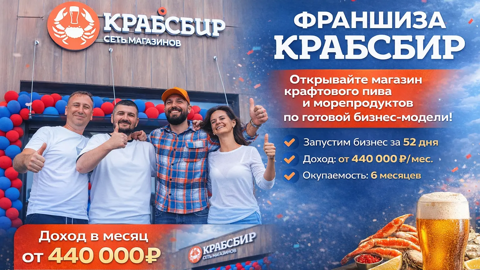 КРАБСБИРСтоимость590 000 ₽Инвестиции2 000 000 ₽Окупаемость6 мес.Доход440 000 ₽Магазины крафтового пива и морепродуктов открыты по всей России, мы предлагаем вам начать свой бизнес с нами и зарабатывать от 440 000 рублей в месяц. Мы поможем вам запустить бизнес за 52 дня. От нас вы получите полный пакет поддержки - помощь с поиском локации, дизайн, контакты поставщиков, маркетинг, обучение, CRM-систему и пошаговые инструкции. Рынок ценителей качественных продуктов и напитков постоянно растёт, и вы можете стать частью этого роста.Франшиза КРАБСБИР — это прибыльный магазин разливных напитков и морепродуктов с доходом от 440 000 рублей в месяц. Готовый формат с высокой маржой и запуском всего за 52 дня. Пиво, крафт, раки, рыба, снеки — продукт ежедневного спроса и стабильных продаж. Бизнес под ключ: проверенные поставщики, обучение, маркетинг, сопровождение на всех этапах. Понятная финансовая модель и окупаемость от 6 месяцев. Заберите прибыльный формат — пока ваш город свободен!