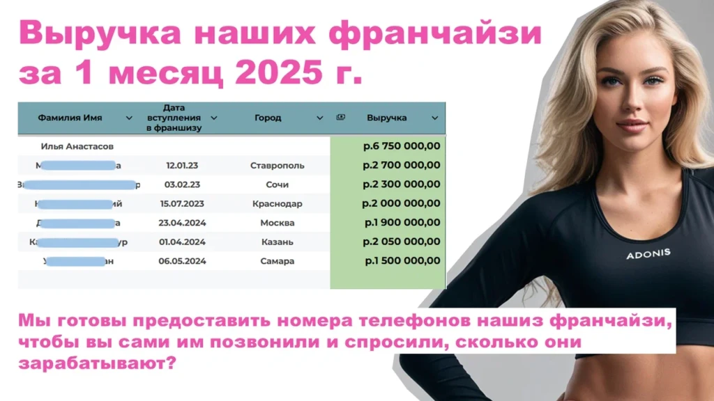 AdonisСтоимость200 000 ₽Инвестиции300 000 ₽Окупаемость3 мес.Доход300 000 ₽Франшиза Adonis позволяет открыть бизнес по производству брендированной продукции: работать с оптом, розницей и маркетплейсами. Гарантируем первые заказы за 14 дней по уникальной системе! Вы получаете всё необходимое для старта: оборудование, обучение, настройку рекламы и помощь в продажах. Средняя прибыль в первый месяц 100 000 рублей. Далее 300к и больше. Бизнес подойдет тем, кто хочет начать свое дело без рисков и сложностей, используя готовую систему. Окупаемость инвестиций 3-4 месяца, а работа не требует специальных навыков — все процессы поможет настроить наша опытная команда.