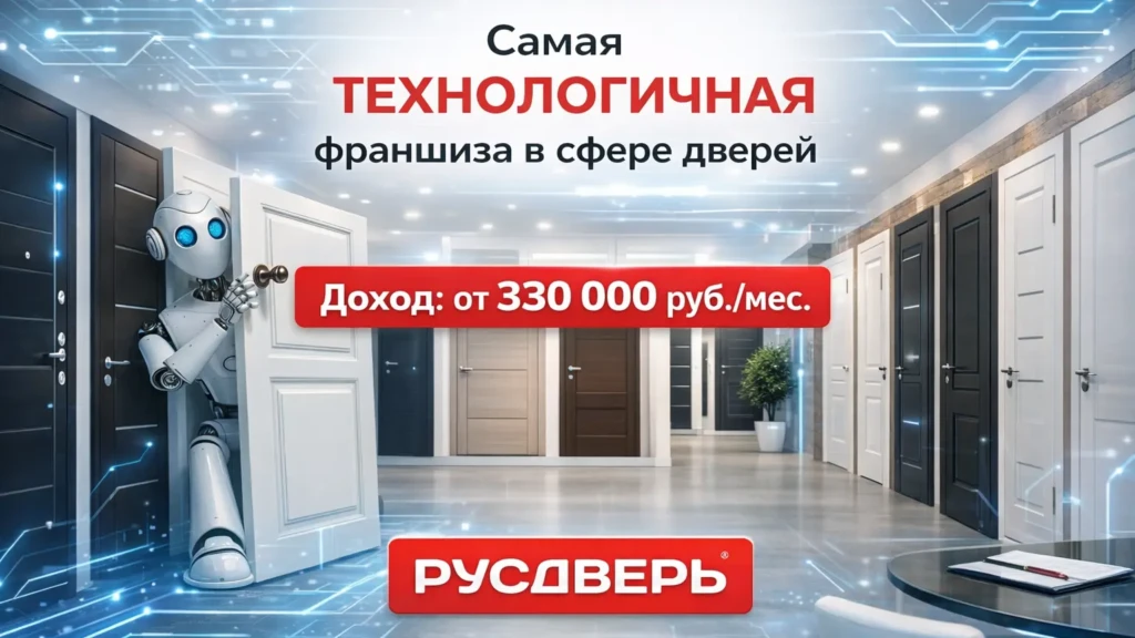 РУСДВЕРЬСтоимость710 000 ₽Инвестиции650 000 ₽Окупаемость4 мес.Доход330 000 ₽Франшиза магазинов дверей с 20-летним опытом. Открыв магазин по нашей франшизе, вы будете зарабатывать от 330 000 рублей в месяц, продавая двери для домов и офисов. Сеть с 200+ точек предлагает обучение, поставки и маркетинг. Преимущество — в стабильном спросе и отлаженной модели. Откройте магазин, где качество обслуживания клиентов будет на высшем уровне, и стройте свой бизнес в надёжной нише, получая поддержку от нашей компании.