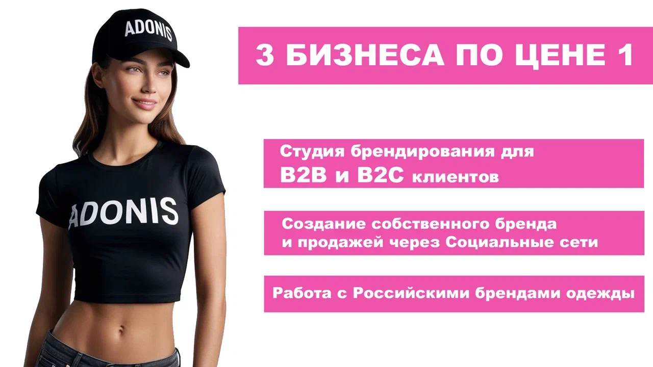 AdonisСтоимость200 000 ₽Инвестиции300 000 ₽Окупаемость3 мес.Доход300 000 ₽Франшиза Adonis позволяет открыть бизнес по производству брендированной продукции: работать с оптом, розницей и маркетплейсами. Гарантируем первые заказы за 14 дней по уникальной системе! Вы получаете всё необходимое для старта: оборудование, обучение, настройку рекламы и помощь в продажах. Средняя прибыль в первый месяц 100 000 рублей. Далее 300к и больше. Бизнес подойдет тем, кто хочет начать свое дело без рисков и сложностей, используя готовую систему. Окупаемость инвестиций 3-4 месяца, а работа не требует специальных навыков — все процессы поможет настроить наша опытная команда.