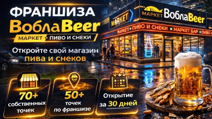 ВоблаbeerСтоимость490 000 ₽Инвестиции1 000 000 ₽Окупаемость4 мес.Доход250 000 ₽Воблаbeer — сети магазинов разливных напитков с 10-ти летней историей и чистой прибылью от 3 000 000 рублей в год. Открыто 70+ собственных магазинов и 50+ франшизных, а 60 % прибыли формируется за счёт собственных сортов пива и снеков. Мы даём подробный план запуска, поддержку и проверенную модель, направление востребовано: рынок крафтового пива растёт на 9% в год.