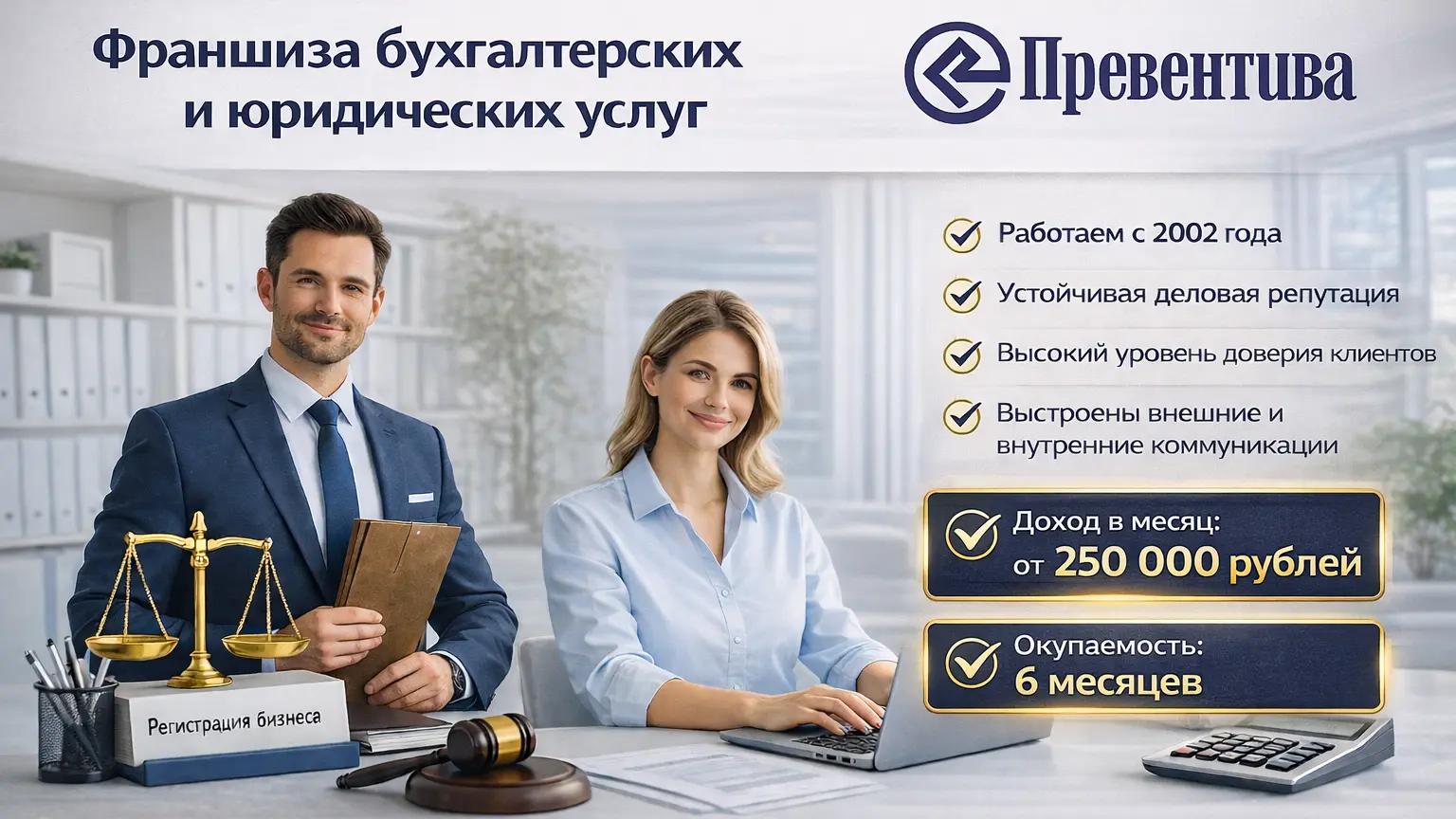 ПревентиваСтоимость580 000 ₽Инвестиции900 000 ₽Окупаемость6 мес.Доход250 000 ₽Франшиза «Превентива» — прибыльный бизнес в сфере бухгалтерии и юриспруденции с принципом «Единого окна». Клиенту не нужны другие подрядчики: от регистрации компании и расчёта зарплаты до налогов и судов — всё у вас. Вы становитесь незаменимым партнёром бизнеса. Поддержка от головного офиса, стандарты, гарантии качества и доход от 250 000 рублей в месяц делают франшизу устойчивой и востребованной. Оставьте заявку и получите подробные условия запуска и сопровождения.