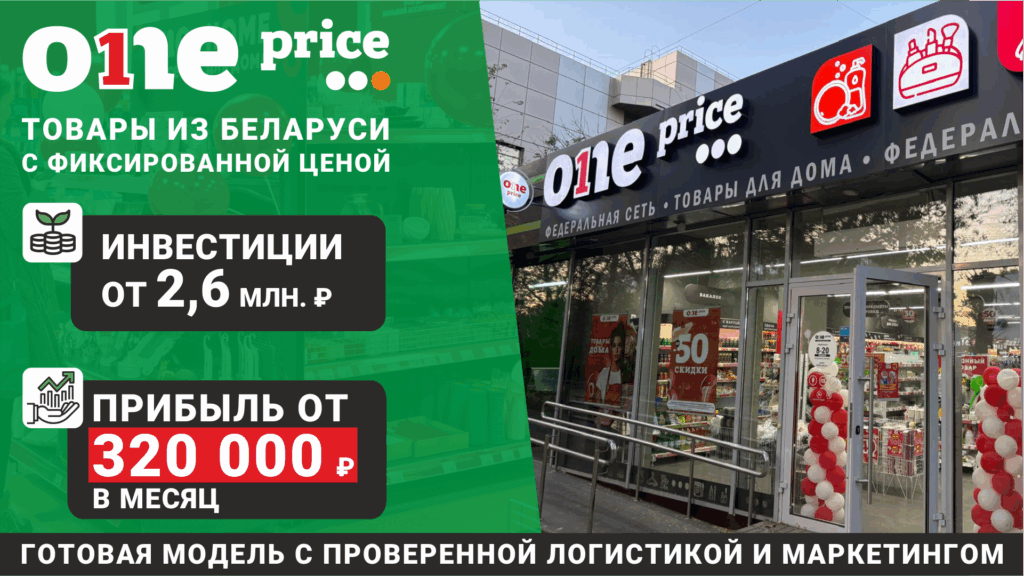 One PriceСтоимость690 000 ₽Инвестиции2 600 000 ₽Окупаемость12 мес.Доход320 000 ₽Франшиза One Price — бизнес с предсказуемым доходом. 350+ магазинов сети, стабильный спрос и фиксированные цены. С нами вы получите уникальные товары, которых нет на полках федеральных сетей и витрине маркетплейсов. А также индивидуальные скидки от поставщиков, обучение в Академии для франчайзи, запуск за 21 день! Мы работаем по проверенной белорусской модели бренда: высокий спрос, быстрая окупаемость, стабильный доход на растущем рынке доступного ритейла. Минимум рисков — максимум поддержки!