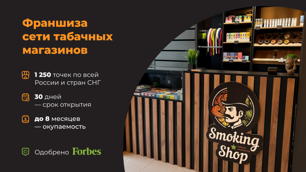 Smoking ShopСтоимость590 000 ₽Инвестиции900 000 ₽Окупаемость6 мес.Доход300 000 ₽Открытие табачного магазина – это возможность войти в стабильный рынок, который продолжает расти. С 2015 года успешно запущено более 1250 точек по России и СНГ. Франчайзи получают до 300 000 рублей ежемесячной прибыли благодаря высокой наценке – до 400%. Предоставляем полный комплект поддержки: от обучающей платформы до помощи в выборе локации, дизайна и поставок. Рынок табачных изделий сохраняет устойчивый рост, и по данным аналитиков, к 2031 году увеличится на 15%. Постройте прибыльный бизнес в перспективной нише с проверенной моделью!
