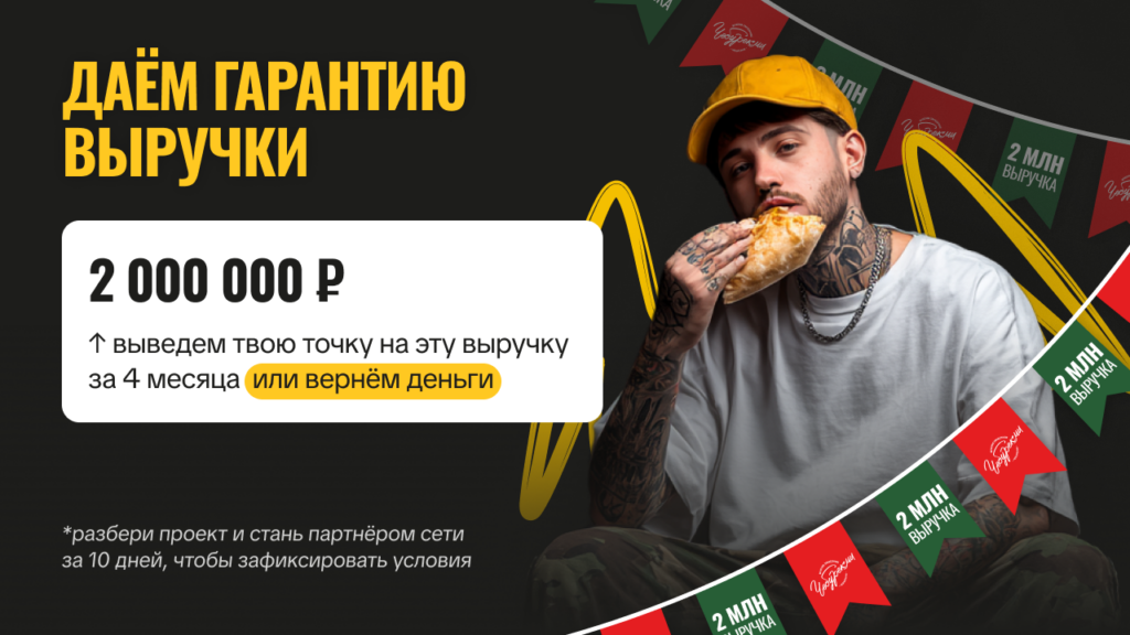 ЧебурекМиСтоимость500 000 ₽Инвестиции700 000 ₽Окупаемость6 мес.Доход700 000 ₽Запуск чебуречной – это вход в динамично растущий рынок стрит-фуда. С 2018 года открыто более 375 точек в 12 странах, и 40% партнеров масштабируются, открывая от 2 до 15 точек. Ежемесячная прибыль достигает 700 000 рублей благодаря востребованному продукту и простой модели. Предоставляем обучение, маркетинговая поддержка и готовая бизнес-модель для городов с населением от 10 000 человек. Рынок фастфуда в России растет на 7–10% ежегодно, обещая стабильный спрос.