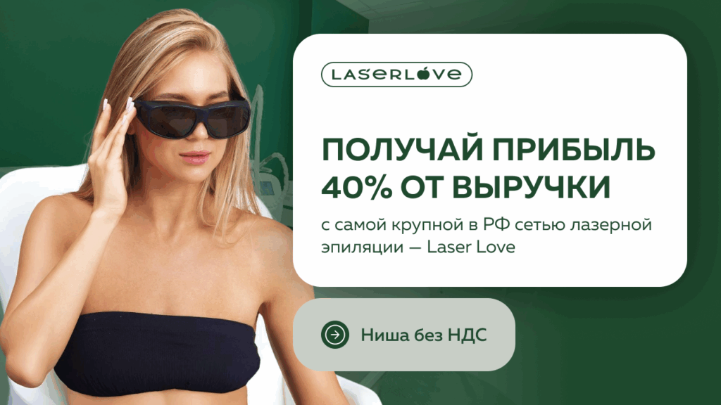 LaserLoveСтоимость900 000 ₽Инвестиции4 600 000 ₽Окупаемость14 мес.Доход1 000 000 ₽Красота не уходит в кризис — люди продолжают инвестировать в себя. Лазерная эпиляция сегодня — один из самых стабильных и быстрорастущих сегментов. С франшизой LaserLove вы входите в бизнес с лидером рынка: более 220 успешно работающих студий по всей России. При поддержке опытной команды управляющей компании партнёры зарабатывают от 400 000 ₽ в месяц при рентабельности до 40%. Оставьте заявку — обсудим детали, гарантии и спецусловия запуска.