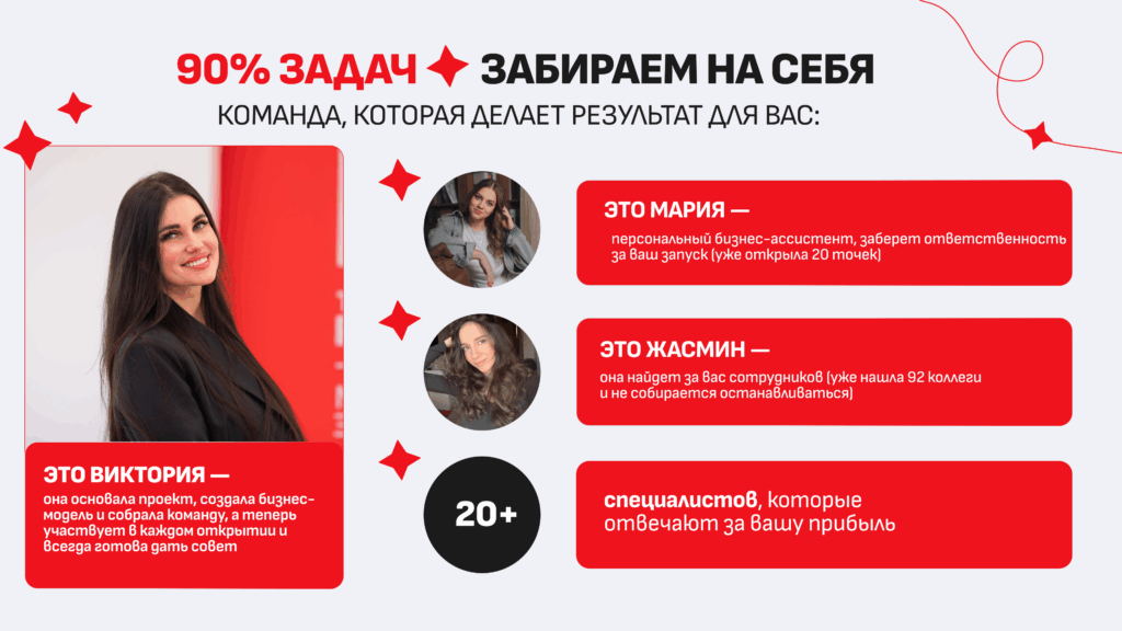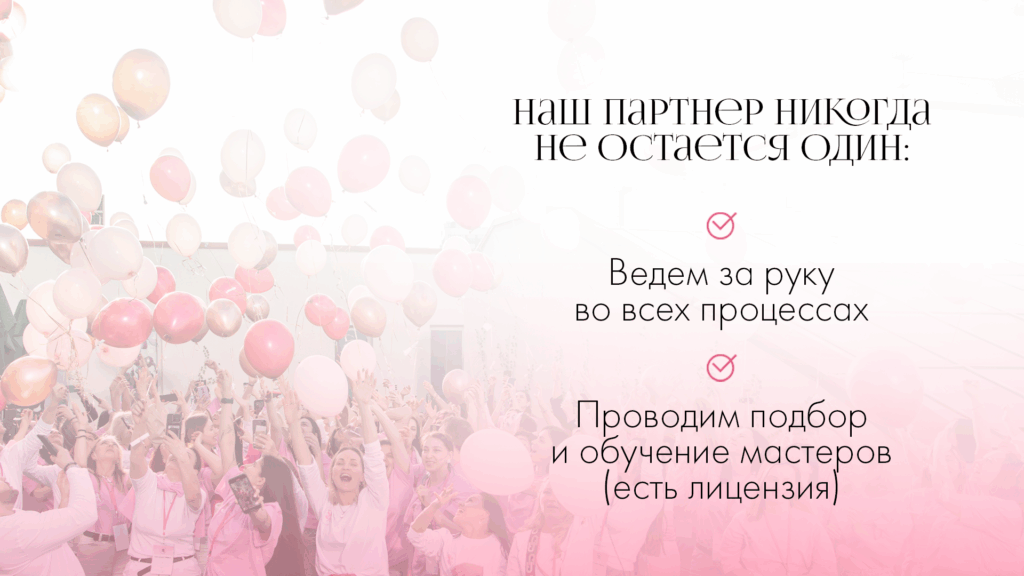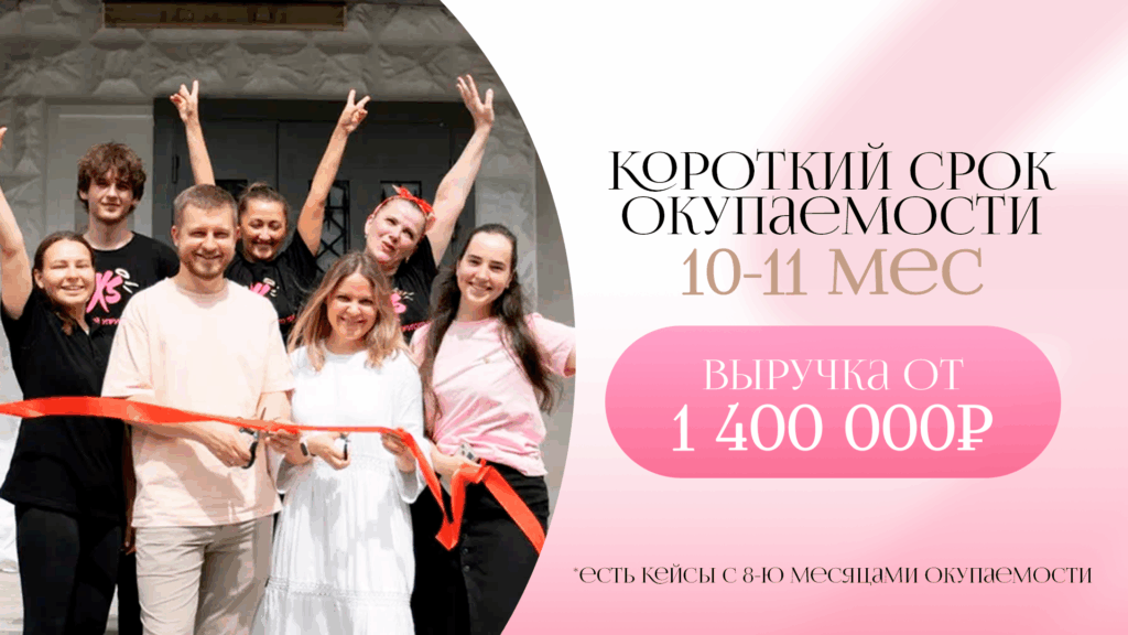 VivatiСтоимость550 000 ₽Инвестиции650 000 ₽Окупаемость15 мес.Доход200 000 ₽Сеть Vivati с 2017 года выросла до 4 собственных и 12 франчайзинговых студий, и этот опыт остаётся актуальным для партнёров сегодня. С нашей поддержкой ваш доход составит от 200 000 руб. Важно: никаких скрытых платежей — нет роялти, коммерческих сборов или обязательных маркетинговых взносов. А поддержка остаётся без сроков от основательницы Виктории, и свобода создания уникального дизайна вашей студии. Актуальность очевидна: индустрия красоты на подъёме, и компактные студии востребованы.