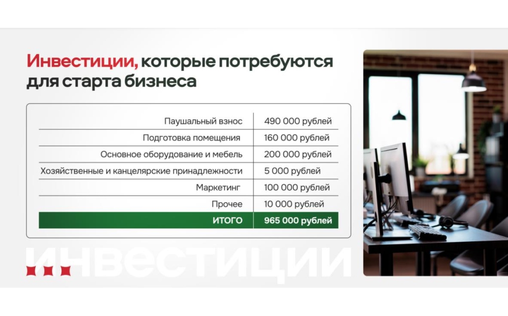 TwinСтоимость450 000 ₽Инвестиции90 000 ₽Окупаемость5 мес.Доход300 000 ₽IT-франшиза нового поколения с доходностью от 300 000 рублей позволит вам зарабатывать на разработке голосовых и чат-ботов для бизнеса, а также получать доход с каждого использования бота. Франшиза позволяет открыть бизнес даже людям, не имеющим опыта в IT-сфере. Рентабельность бизнеса достигает более 22,7% по чистой прибыли.