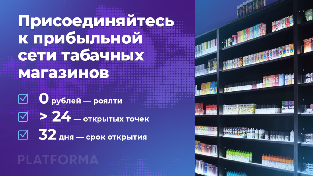 Алекс ГраальСтоимость360 000 ₽Инвестиции847 500 ₽Окупаемость3 мес.Доход350 000 ₽Федеральная сеть табачных магазинов с 21 прибыльной точкой и более 15 лет опыта. Зарабатывайте от 335 000 руб. ежемесячно с одной точки. Концепция: эстетичные и уютные магазины в шаговой доступности с широким ассортиментом табачной, вейп- и кальянной продукции по лучшим ценам. Вы получаете готовую бизнес-модель, опыт команды и полную поддержку на всех этапах запуска, ведения и масштабирования. Бизнес стабильно растёт и остаётся востребованным в каждом районе.