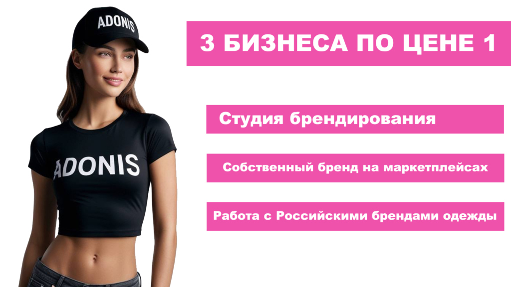 AdonisСтоимость200 000 ₽Инвестиции300 000 ₽Окупаемость3 мес.Доход300 000 ₽Франшиза Adonis позволяет открыть бизнес по производству брендированной продукции: работать с оптом, розницей и маркетплейсами. Гарантируем первые заказы за 14 дней по уникальной системе! Вы получаете всё необходимое для старта: оборудование, обучение, настройку рекламы и помощь в продажах. Средняя прибыль в первый месяц 100 000 рублей. Далее 300к и больше. Бизнес подойдет тем, кто хочет начать свое дело без рисков и сложностей, используя готовую систему. Окупаемость инвестиций 3-4 месяца, а работа не требует специальных навыков — все процессы поможет настроить наша опытная команда.