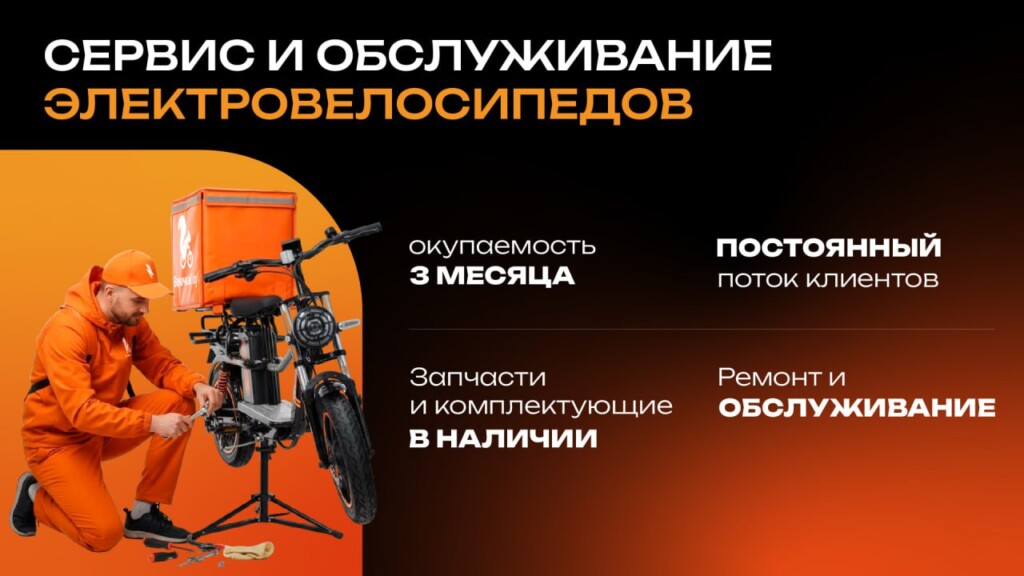 ВелочкаГоуСтоимость410 000 ₽Инвестиции80 000 ₽Окупаемость5 мес.Доход450 000 ₽Франшиза «ВелочкаГоу» — уникальный проект, объединяющий 3 направления: сервис электротранспорта, рекрутинг курьеров для служб доставки и аренду электровелосипедов для курьеров. Средняя чистая прибыль после выхода на плановые показатели может достигать до 700 000 руб. в месяц. Для новых партнёров предлагается велопарк из 15 электровелосипедов всего за 890 000 руб..