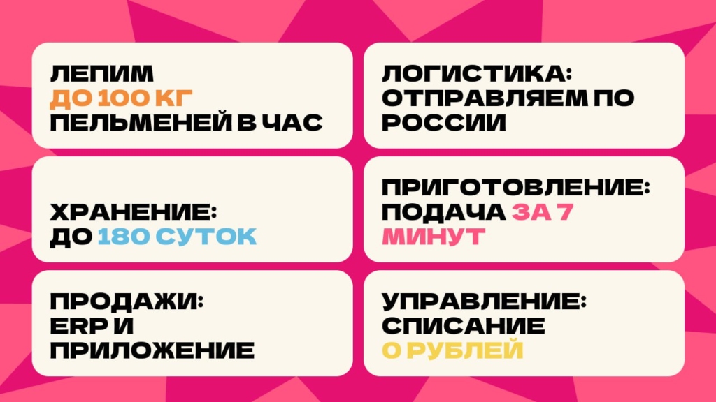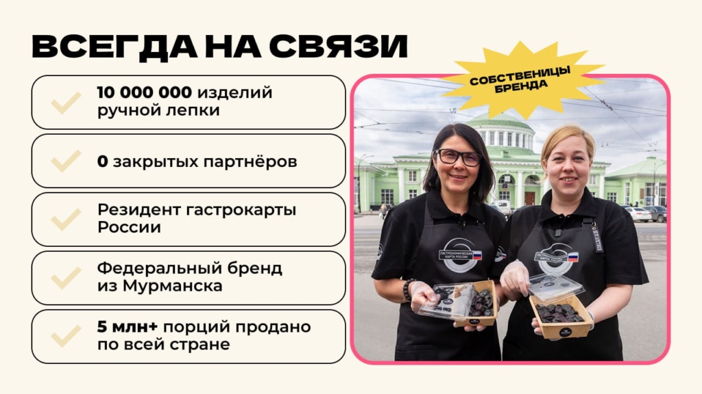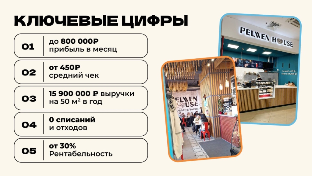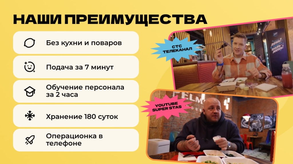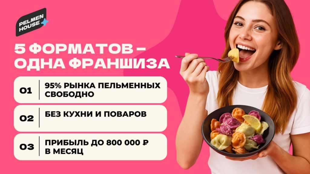 Pelmen houseСтоимость490 000 ₽Инвестиции800 000 ₽Окупаемость8 мес.Доход1 800 000 ₽95% рынка пельменных в России свободны. Pelmen House — франшиза №1: запуск за 4 недели, прибыль до 800 000 ₽ в месяц. Российский СТРИТ_ФУД: тонкое тесто, мясо, ручная лепка, авторские начинки. Без поваров Без кухни — 90% меню заморозка , хранится 180 суток, подача за 7 минут. Обучение персонала 2 часа. Победитель, 2 года подряд Гастрокарты России. 5 форматов — киоск, фудтрак, фудкорт, кафе или вендинг 24/7. Пельмени уже в ТОП-3 блюд страны. А пельменных почти нет. Забирай свой город первым!