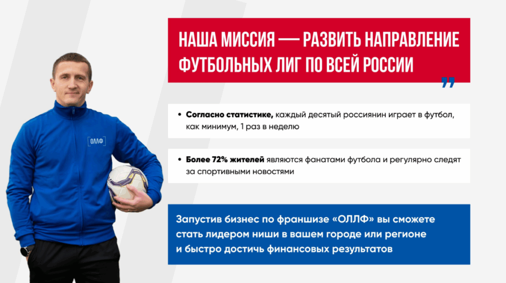 ОЛЛФСтоимость300 000 ₽Инвестиции100 000 ₽Окупаемость6 мес.Доход183 000 ₽Франшиза «ОЛЛФ» — откройте любительскую футбольную лигу для офисных сотрудников, друзей и предпринимателей. Запуск за 17 дней. Все матчи сопровождаются: арбитры, трансляции, фотоотчёты, статистика, конкурсы от партнёров. За 12 лет проведено 600+ турниров, 12 000 игр. Стабильный доход и проверенная бизнес-модель для вашего региона. Начни зарабатывать на любви к футболу!
