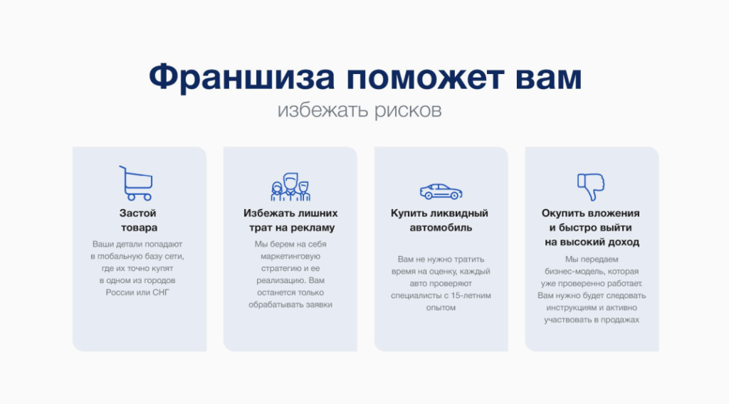 Детальный подходСтоимость490 000 ₽Инвестиции800 000 ₽Окупаемость5 мес.Доход600 000 ₽Проверенная бизнес-модель в нише продажи б/у автозапчастей. Маржинальность до 1000% с чистой прибылью от 200 000 руб. в месяц с одного машино-комплекта. Партнёрам доступны: надёжные поставщики, автоматизированная бизнес-модель, поставка комплектов из Англии, ОАЭ, США и СНГ, готовый интернет-магазин и полная поддержка на всех этапах запуска и ведения бизнеса. Это возможность войти в высокодоходную и стабильную нишу с минимальными рисками.