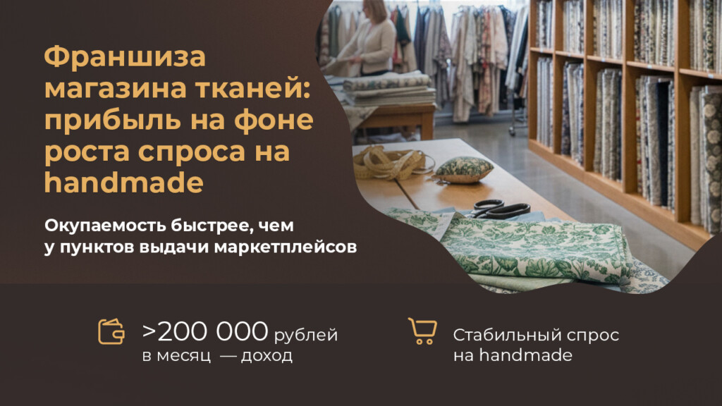 ФрейяСтоимость360 000 ₽Инвестиции958 500 ₽Окупаемость5 мес.Доход200 000 ₽Фрейя — магазин тканей, фурнитуры и товаров для рукоделия с брендом, который ценят мастера и рукодельницы. Доход от 200 000 рублей и окупаемость при грамотной локации уже через 5 месяцев. Вы получаете готовую бизнес‑модель: оптовые закупки в Краснодаре + эксклюзив из Екатеринбурга, маркетинг в Telegram‑канале, акции для клиентов, лояльную аудиторию и растущий спрос на ручную работу. Всё, что нужно — помещение и желание развивать дело.