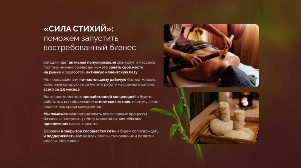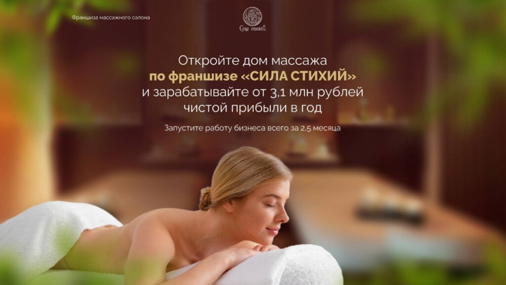 Сила СтихийСтоимость300 000 ₽Инвестиции1 200 000 ₽Окупаемость7 мес.Доход200 000 ₽«Сила Стихии» — место, куда приходят за глубоким восстановлением. Интерьер в эстетических тонах, тихая музыка, мантры — всё создано для полного погружения в атмосферу спокойствия. Мы предлагаем обширный выбор СПА-программ и уникальный египетский массаж для восстановления гармонии тела и духа. Франшиза предоставляет полностью готовый бизнес-формат: стандарты обслуживания, обучение персонала, дизайн, маркетинг и сопровождение. Создайте в своём городе точку притяжения, куда люди захотят возвращаться снова и снова.