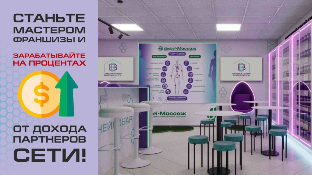 Фабрика здоровья SkobelСтоимость700 000 ₽Инвестиции1 050 000 ₽Окупаемость6 мес.Доход410 000 ₽Фабрика здоровья Skobel — сеть, где каждый может избавиться от боли в спине с помощью магнитно‑волнового массажа. Это полный ЧЕКАП организма и более 600 товаров для здоровья и спорт‑питания. Услуги не требуют медицинской лицензии и образования. Команда и ее основатель уже имеют успешный опыт в масштабировании с 2013 года. Трендовый бизнес с гарантией окупаемости и мастер‑франшизой, позволяющей зарабатывать не только на товарах и услугах, но и на продаже франшиз и их оборота.
