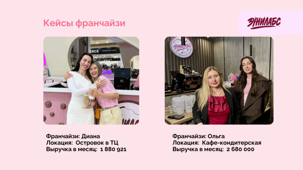 ЗунилабсСтоимость790 000 ₽Инвестиции350 000 ₽Окупаемость3 мес.Доход630 000 ₽Кофейня ЗУНИЛАБС — уютное место, которое привлекает гостей, особенно зумеров, своими фирменными двойными напитками — дабблами, знакомыми всему городу, и необычными печеньями — кукисами. Формат выстроен так, чтобы партнёр с первого дня видел, как растёт его прибыль. Доход — от 630 000 руб. в месяц. Бренд, стандарты, рецептуры и поддержка уже готовы. Вам остаётся открыть двери и встретить гостей!