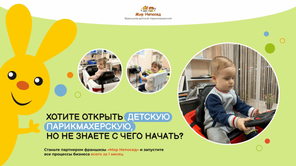 Мир НепоседСтоимость350 000 ₽Инвестиции1 341 000 ₽Окупаемость15 мес.Доход110 000 ₽Франшиза детской парикмахерской — это проверенная модель с 10-летним опытом. Яркий интерьер, игровые зоны и маленькие подарки создают атмосферу праздника. Средний чек - 1000 руб., рентабельность бизнеса от 28%. Вы получите готовую концепцию, опытных наставников, поддержку на каждом этапе и сможете зарабатывать от 1 300 000 руб. чистой прибыли в год, развивая узнаваемый бренд в растущей нише.