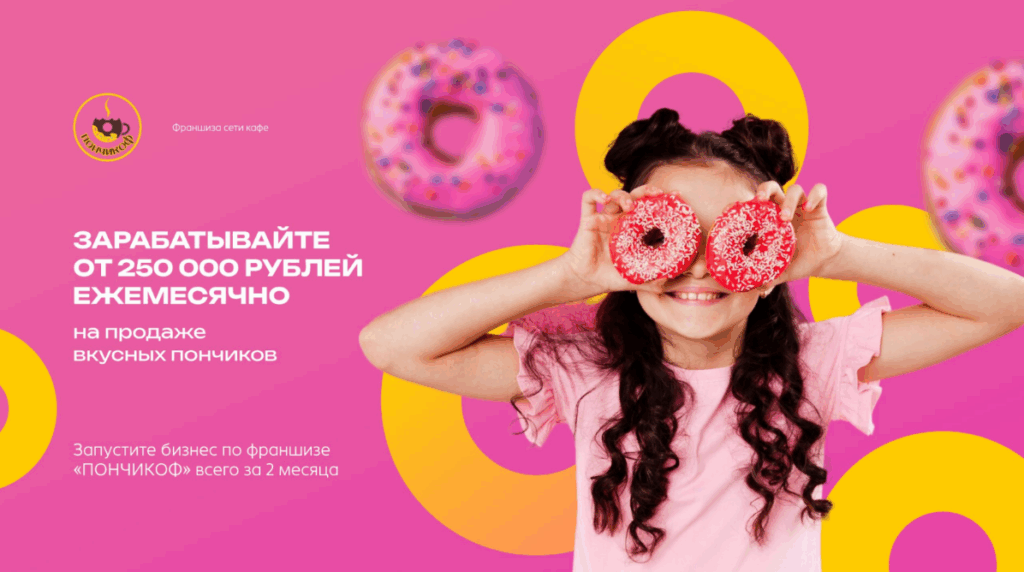 ПончикофСтоимость360 000 ₽Инвестиции1 800 000 ₽Окупаемость16 мес.Доход250 000 ₽Пончиковая «Пончикоф» — бизнес, который невозможно пройти мимо. Пышные, горячие пончики с щедрыми начинками, которые становятся вашим фирменным отличием на рынке. Производство устроено так, чтобы вы могли работать быстро, стабильно и с минимальным штатом, обеспечивая постоянный поток клиентов. Формат универсален: островок в ТРЦ, небольшое кафе или точка навынос. Это бизнес, который дарит людям эмоции, а вам — регулярный доход уже в первые месяцы.