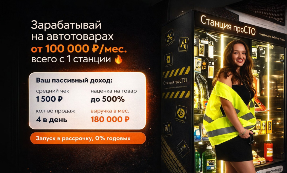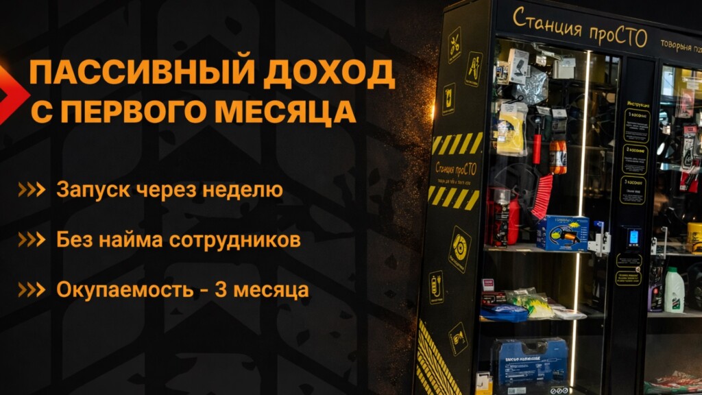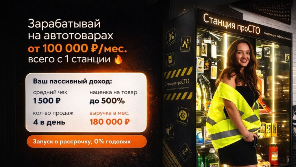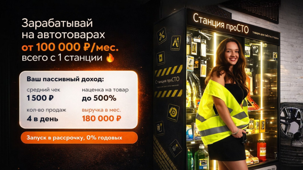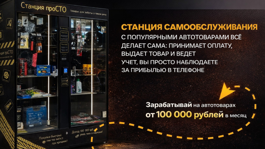 Станция ПРОСТОСтоимость240 000 ₽Инвестиции90 000 ₽Окупаемость3 мес.Доход100 000 ₽Станция проСТО — бизнес на автотоварах без персонала. Доход с первых месяцев! Готовый каталог из 100+ ходовых автотоваров, автоматические продажи 24/7 с контролем в телефоне. Мы запускаем под ключ:локация, юр. оформление, закупки, обучение и сопровождение. Без роялти. Гарантия продаж и окупаемости — по договору. Занятость — до 3 часов в неделю.