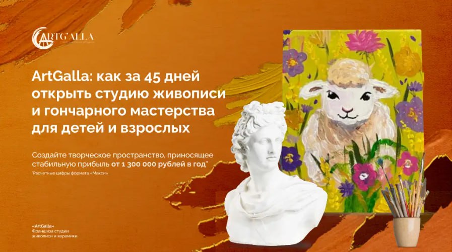 ArtGallaСтоимость360 000 ₽Инвестиции1 416 000 ₽Окупаемость3 мес.Доход110 000 ₽Откройте франшизу арт-студии «ArtGalla» — пространства творчества и вдохновения! Мы объединяем живопись и гончарное мастерство, предлагая увлекательные мастер-классы для детей и взрослых. Каждый посетитель получает не просто досуг, а впечатления и творческий результат, который можно забрать домой. В ассортименте: занятия, праздники, роспись стен, аренда зала и продажа изделий. Станьте нашим партнёром и воплотите мечту о прибыльном творческом бизнесе уже сегодня!