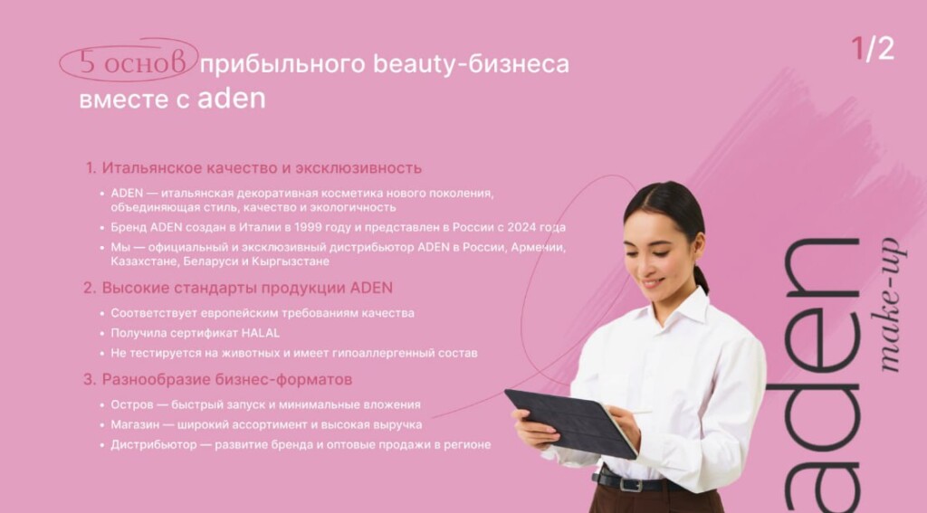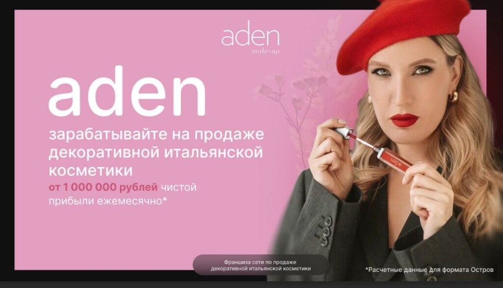 ADENСтоимость360 000 ₽Инвестиции625 500 ₽Окупаемость6 мес.Доход325 000 ₽Франшиза ADEN — лёгкий вход в бьюти-бизнес с высокой маржой. Мы — официальный дистрибьютор итальянского бренда ADEN в России. Мы предлагаем эксклюзивные продукты с безупречной репутацией: соответствуют стандарту HALAL, веган-формуле, гипоаллергенны и не тестируются на животных. Наши партнёры зарабатывают от 325 000 рублей в месяц. Вы получаете федеральную рекламу, участие в выставках и конференциях, а также поддержку на всех этапах. Станьте нашим партнёром — откройте точку ADEN и подарите клиентам красоту, которой можно доверять.