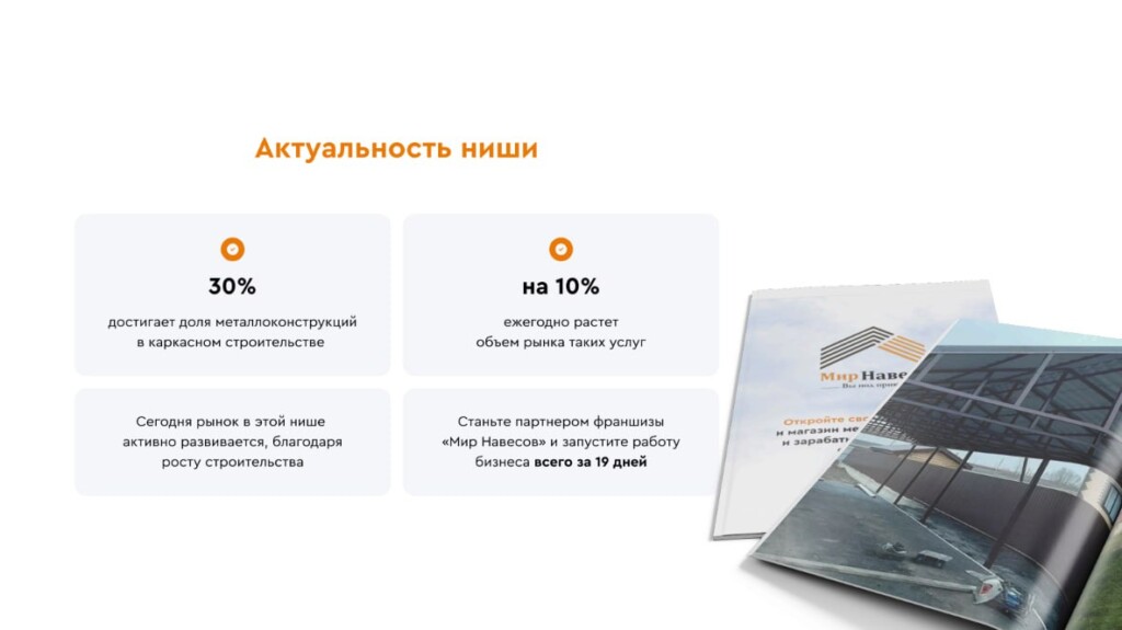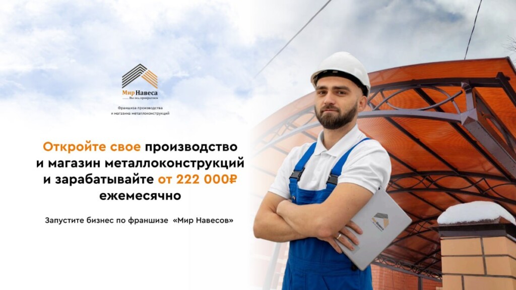 Мир НавесаСтоимость360 000 ₽Инвестиции397 500 ₽Окупаемость6 мес.Доход140 000 ₽«Мир навесов» — франшиза по производству премиальных металлоконструкций для частных территорий. Мы занимаемся изготовлением автонавесов, террасами, парковочными системами, павильонами и декоративными элементами с художественной ковкой. Используем чистый металл по оптовым ценам, профессиональную покраску и только опытных мастеров. Гарантированное качество по немецким стандартам и уникальные проекты привлекают клиентов и обеспечивают стабильный доход партнёрам.