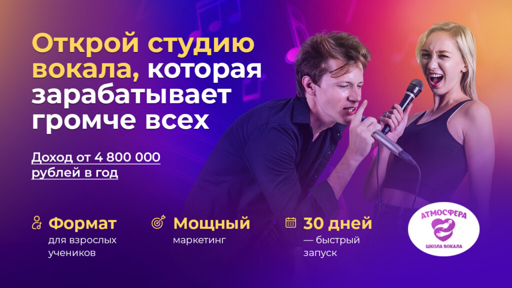 АтмосфераСтоимость490 000 ₽Инвестиции700 000 ₽Окупаемость5 мес.Доход400 000 ₽Мы специализируемся на преподавании вокала для взрослой аудитории. Открыв школу вокала, вы сможете зарабатывать от 400 000 рублей ежемесячно. Мы используем проверенную стратегию, которая успешно зарекомендовала себя на рынке образовательных услуг. В условиях активного роста сегмента личностного развития, наша ориентация на развитие творческих способностей и самовыражения позволяет создавать высокорентабельные образовательные проекты.
