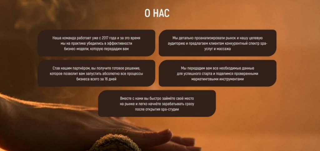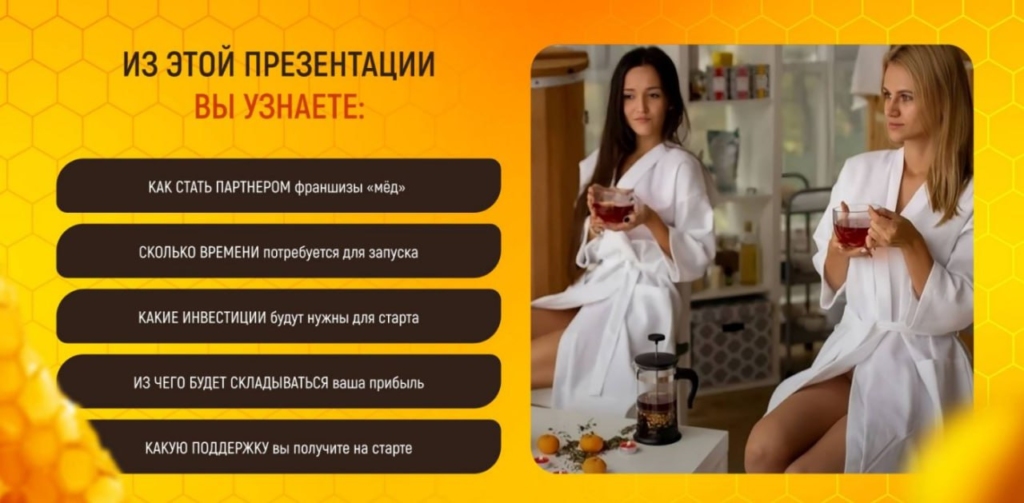 Медовая лунаСтоимость360 000 ₽Инвестиции280 000 ₽Окупаемость6 мес.Доход217 000 ₽SPA-студия «Медовая луна» — ваш путь к гармонии и красоте с 2017 года! Мы создали место, где каждый гость находит умиротворение и заботу. Предлагаем антицеллюлитный, оздоровительный и расслабляющий массаж, комплексные SPA-программы для восстановления сил и внутреннего баланса. Получите готовую бизнес-модель, обучение персонала, маркетинговую поддержку и помощь в запуске. Мы обеспечим всё для успешного старта!